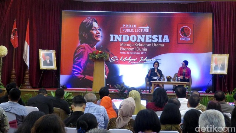 Jakarta - Menteri Keuangan Sri Mulyani Indrawati malam ini hadir sebagai pembicara dalam acara Projo Public Lecture. Projo adalah organisasi masyarakat pendukung Presiden Joko Widodo (Jokowi) atau Pro Jokowi.